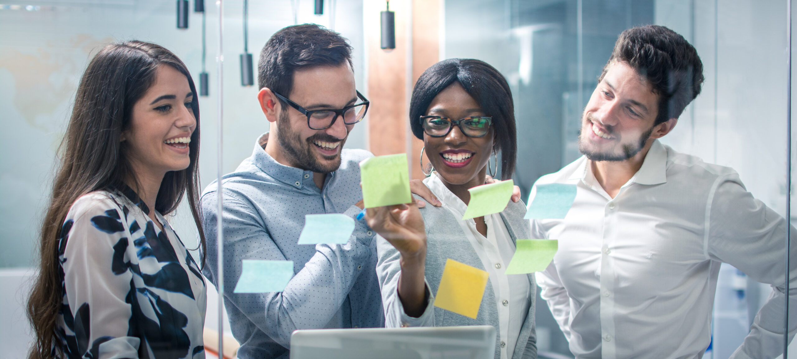 Panoramic view creative group of business people working with sticky notes on glass wall in office